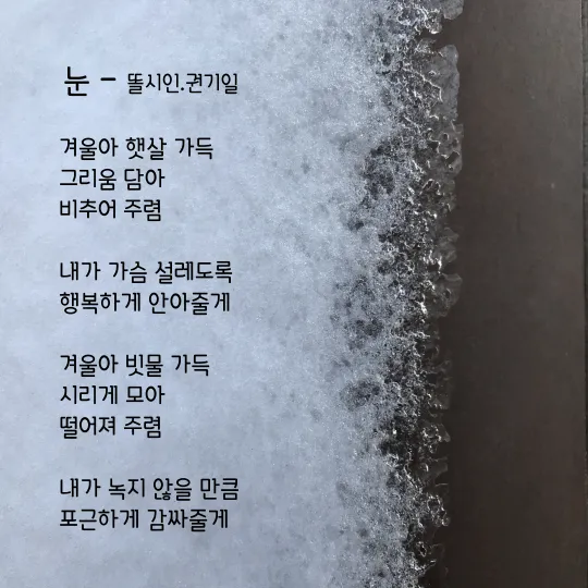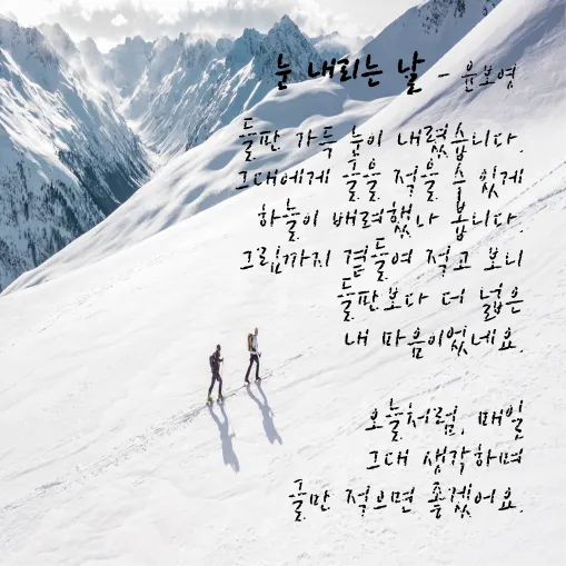하얀 눈이 내리면 설레고, 내 마음이 따뜻해지고 , 나의 입가에 미소를 띠고, 내리는 눈을 함께 보고픈 사람을 떠올리게 됩니다. 이 시간에는 차가운 바람이 내 볼을 따갑게 할 때, 하늘에서 눈이 내릴 때 추운 겨울 내 마음을 따뜻하게 하고 싶은 때 생각나게 하는 시를 올려보도록 하겠습니다.