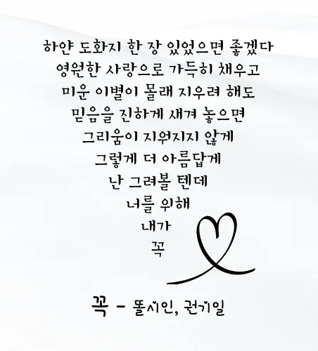 하얀 눈이 내려 길가에 들판에 쌓이게 되면 그곳에 그림을 그리거나 사랑하는 사람의 이름을 끼적여 본 적 있나요? 저는 작년에도 하얀 눈 위에 사랑하는 사람에게 편지를 남겼었습니다. ^^ 40대 중반이 되어도 사라지지 않는 사랑의 마음. 올해 역시 하얀 눈 위에 사랑을 속삭일 수 있도록 하얀 눈이 내려주면 좋겠습니다.